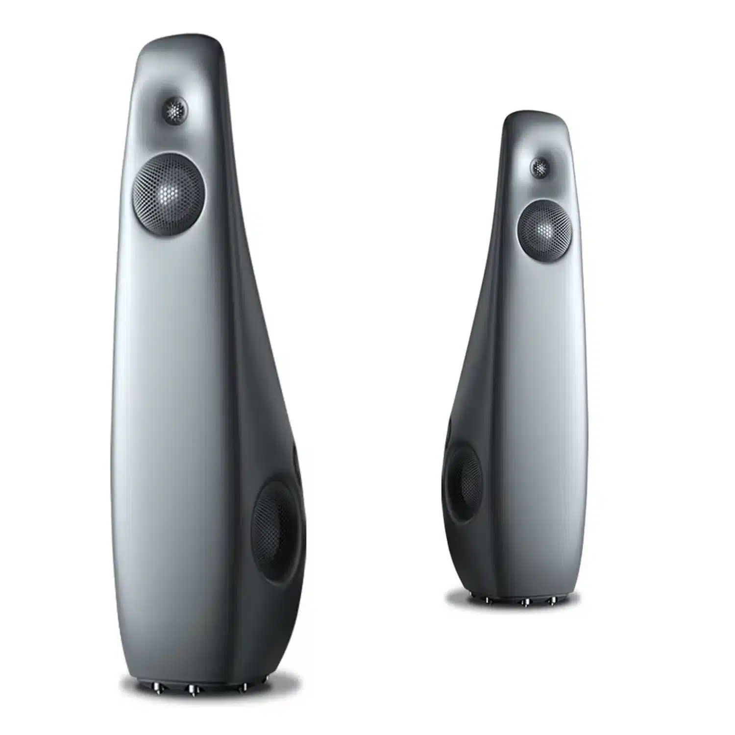 Enceinte colonne Vivid Audio Kaya 90 grise foncée vue de trois-quart avec les haut-parleurs d'aigu et de médium à l'avant et deux haut-parleur de grave l'un au-dessus de l'autre sur le côté