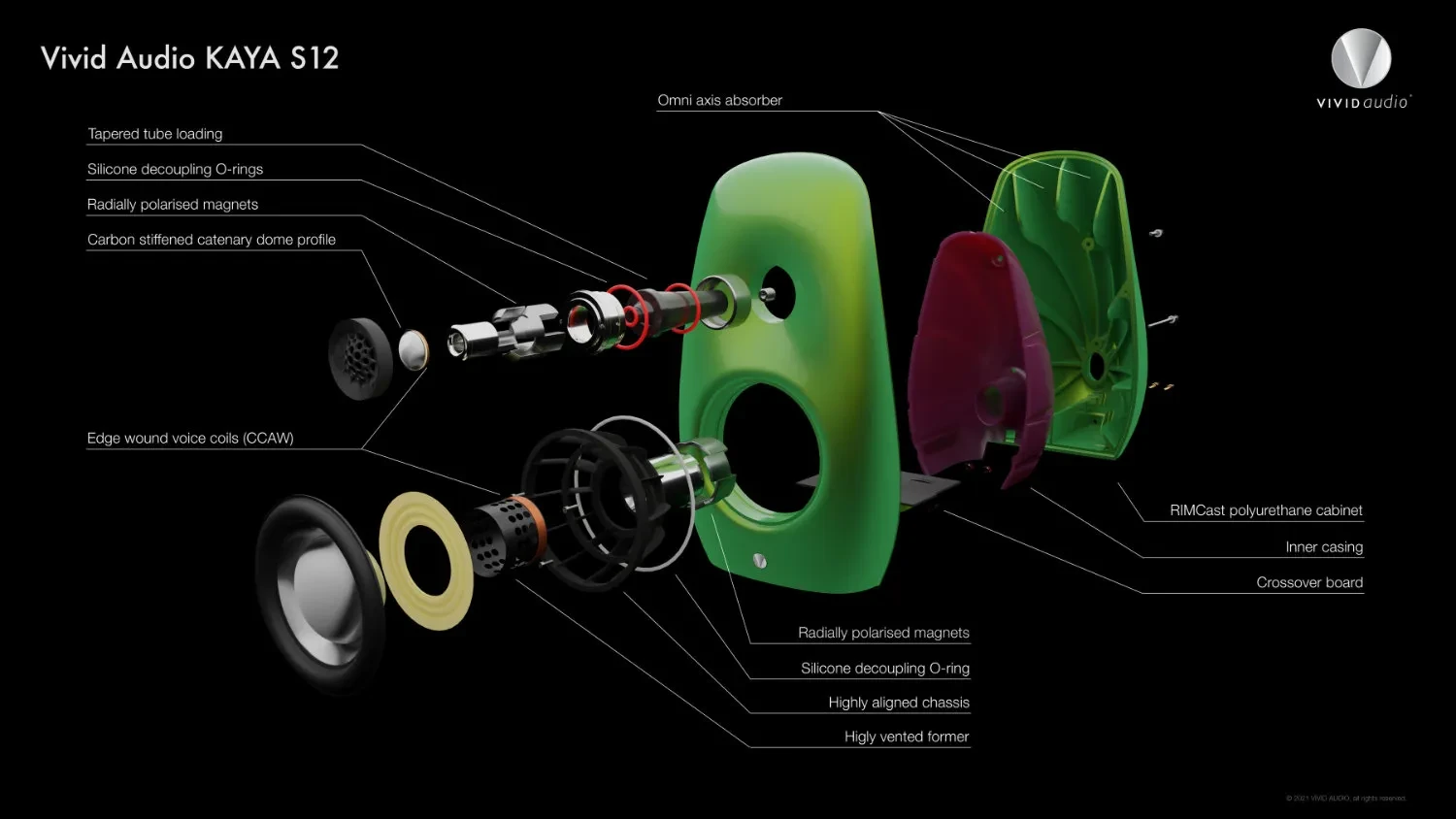 Malgré un volume de 12 litres, sa conception bass reflex avec un absorbeur omnidirectionnel à tube conique, de manière à supprimer les résonances dans toutes les directions, cette enceinte est capable de reproduire les fréquences les plus basses (45Hz) sans vibration. Bénéficiant de cette charge presque idéale, le nouveau haut-parleur C100D à longue portée offre des basses précises et nettes ainsi que des médiums transparents, non colorés à un niveau étonnamment élevé. Les hautes fréquences sont gérées par le tweeter D26 haute performance à tube conique utilisé dans toute la gamme VIVID AUDIO. La Kaya S12 est moulée à partir d’un matériau composite disponible dans une gamme de finitions automobiles standard et personnalisées.