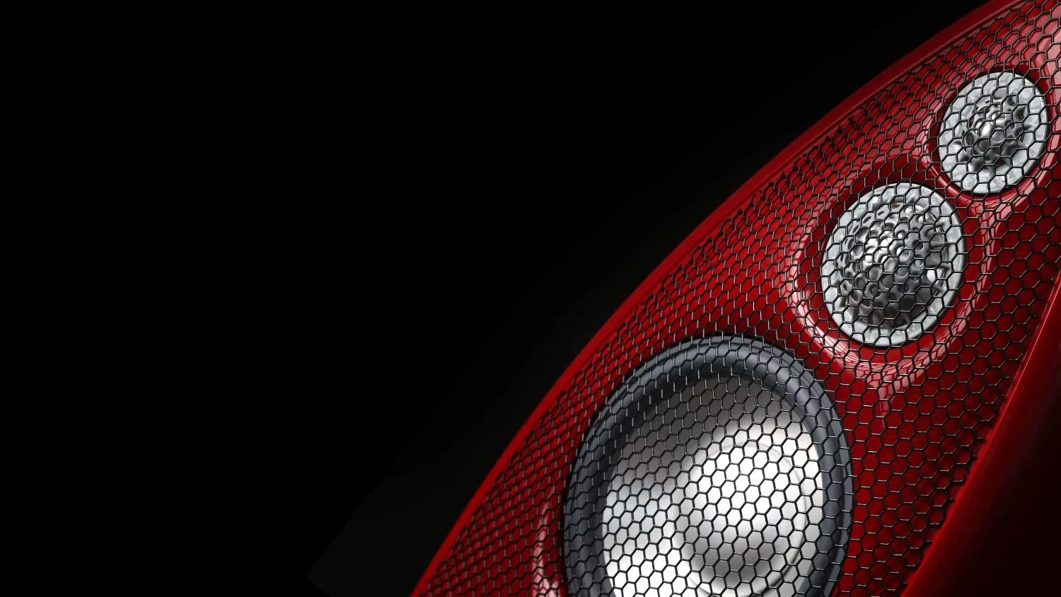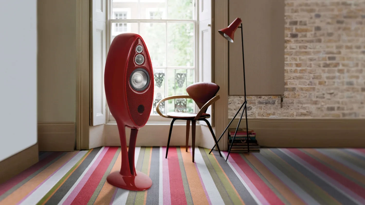 Paire d'enceintes Vivid Audio Oval B1 Decade rouges posées l'une devant l'autre dans des angles différents avec trois haut-parleurs en façade et l'évent Bass-reflex situé en dessous