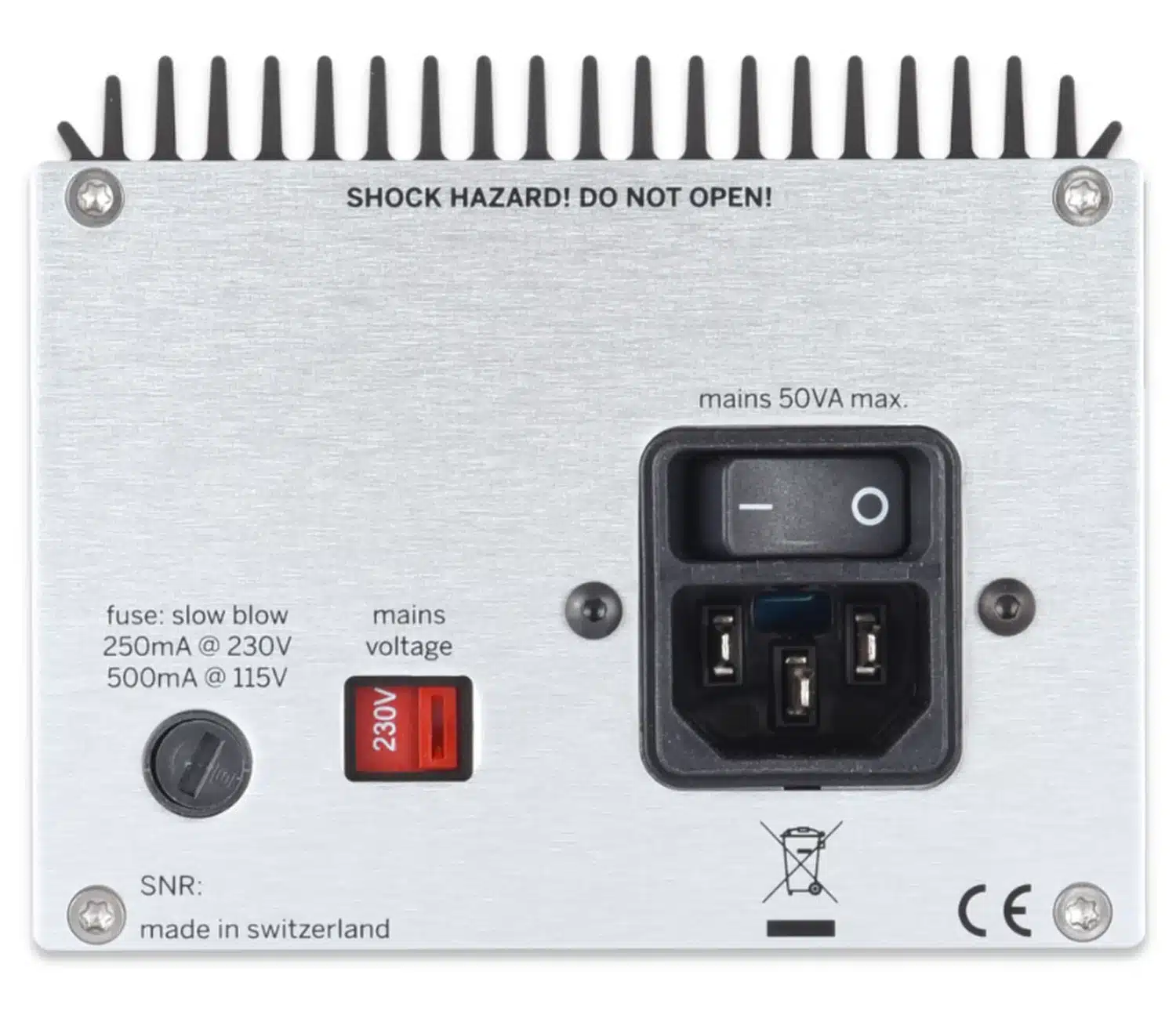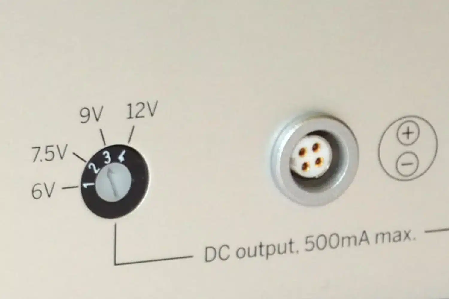 La WEISS PSU102dispose d’une entrée d’alimentation de type IEC avec un sélecteur de tension d’entrée (nominal 115V ou 230V), un interrupteur marche/arrêt et un fusible principal. Il y a deux prises de sortie câblées en parallèle. Les prises sont fabriquées par la société suisse Fischer et sont de très haute qualité. La tension de sortie peut être réglée à 5V, 6V, 9V ou 12V. La capacité de courant de sortie atteint 1,5A pour les deux sorties combinées. Les sorties sont protégées contre les courts-circuits.”