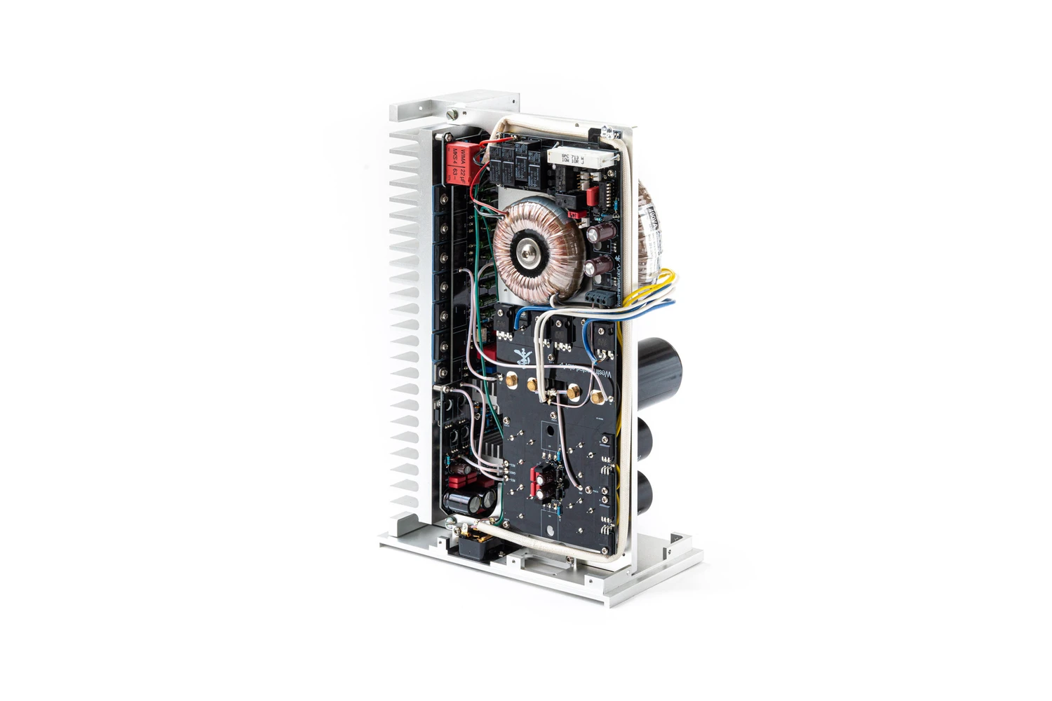 Un des composants clés du châssis, où l’électronique de l’amplificateur est montée, est le dissipateur thermique principal. Ce dernier remplit une double fonction : il sert de structure mécanique rigide tout en assurant une dissipation efficace de la chaleur. Cependant, atteindre un équilibre est complexe, car une grande surface, nécessaire à la dissipation thermique, peut aussi introduire des effets indésirables sur le son en absorbant certaines fréquences.
