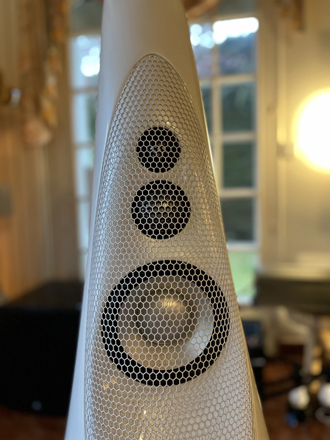 Cette paire d’enceintes passives Vivid Audio G2 en couleur Lexus Pearl White, Lexus de la marque de voiture dont Vivid utilise le nuancier des peintures multicouches, a été achetée sans même avoir été écoutée par leur heureux propriétaire. Après avoir possédé des Tune Audio Anima puis des Wilson Benesch Resolution 3 qui ont laissé le Client sur sa faim, les Vivid Audio G2 ont comblé toutes ses attentes dans tout le spectre sonore : beaucoup de détail et de finesse dans le medium-aigu ainsi que beaucoup de maîtrise dans le grave grâce aux deux HP de grave montés en opposition dans chaque enceinte.